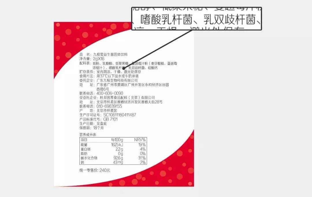 九極愛益生菌產(chǎn)品配料表上明確標示著菌種菌株: